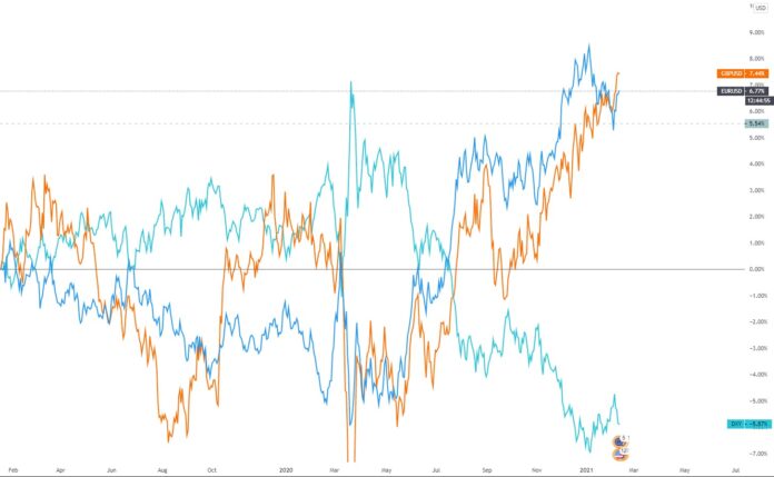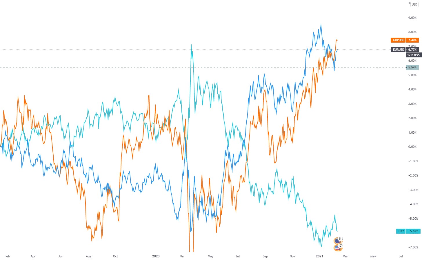 Nếu chúng tôi mua EURUSD và mua GBPUSD, chúng tôi bày tỏ quan điểm rằng đồng đô la Mỹ sẽ suy yếu và các loại tiền tệ đó sẽ mạnh lên. Nhưng nếu đồng đô la Mỹ tăng sức mạnh, cả đồng euro và bảng Anh rất có thể sẽ giảm giá do mối tương quan nghịch đảo mạnh với đồng đô la Mỹ, có thể thấy trong biểu đồ bên dưới. Đường màu xanh lam tượng trưng cho EURUSD, đường màu cam GBPUSD và đường màu xanh lá cây của Chỉ số Đô la.